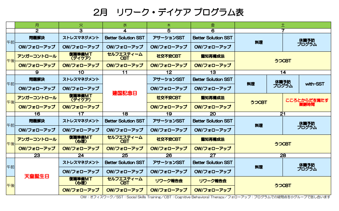 うつ病などにより休職している方の、復職支援を目的としたプログラムです。 当院リワーク・デイケアでは認知行動療法(CBT)を主軸とし、休職に至った本人側の要因(思考のクセや対人関係パターン)について振り返る機会を多くもつことで、復職しても再休職することなく働き続けられるよう支援を行っています。また、リワーク・デイケア卒業後も休職予防プログラムの一環として土曜日に参加できるプログラムも実施しています。