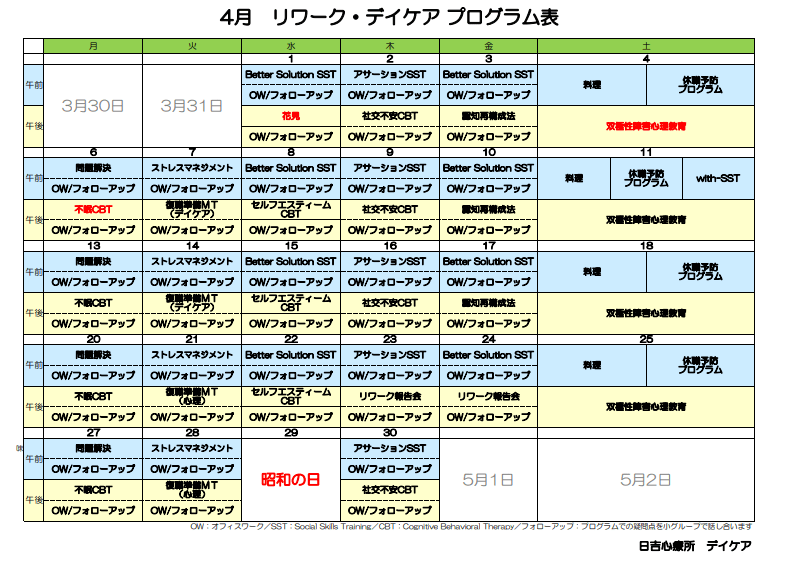 うつ病などにより休職している方の、復職支援を目的としたプログラムです。 当院リワーク・デイケアでは認知行動療法(CBT)を主軸とし、休職に至った本人側の要因(思考のクセや対人関係パターン)について振り返る機会を多くもつことで、復職しても再休職することなく働き続けられるよう支援を行っています。また、リワーク・デイケア卒業後も休職予防プログラムの一環として土曜日に参加できるプログラムも実施しています。