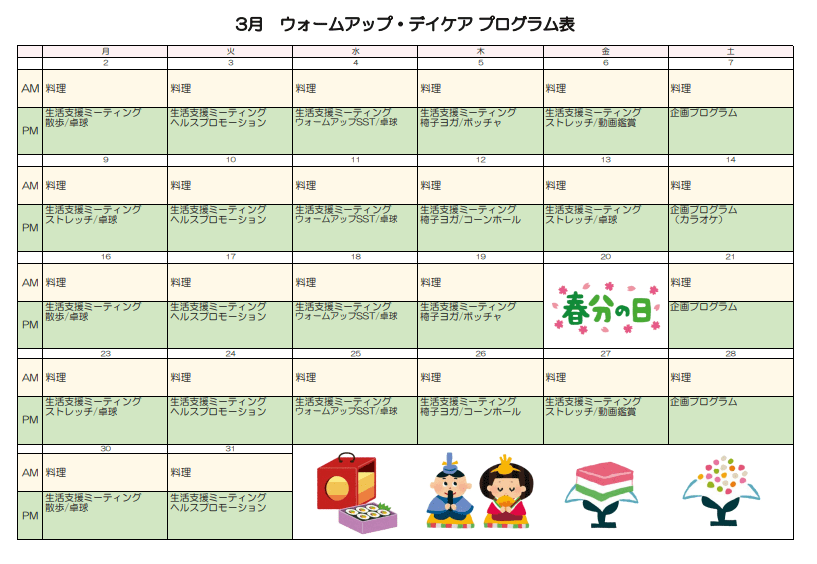 ウォームアップ・デイケアでは調理・スポーツ・作業系のプログラムを多く実施しており、日中の居場所としての活用や生活リズムの獲得・体力作りに取り組むことができます。
